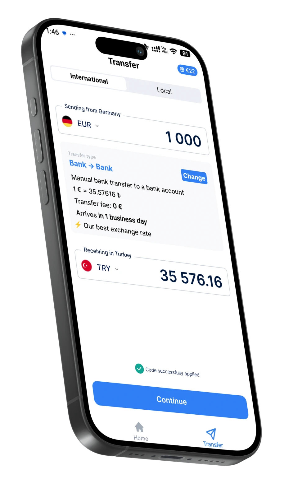 TransferGo yurt dışından Türkiye’ye para gönderme konusunda kullanıcılarına esneklik sunuyor. Aynı anda birden fazla transfer talimatı oluşturabilir ve bu emirlerle toplamda 1 milyon TL’ye kadar gönderebilirsiniz.
